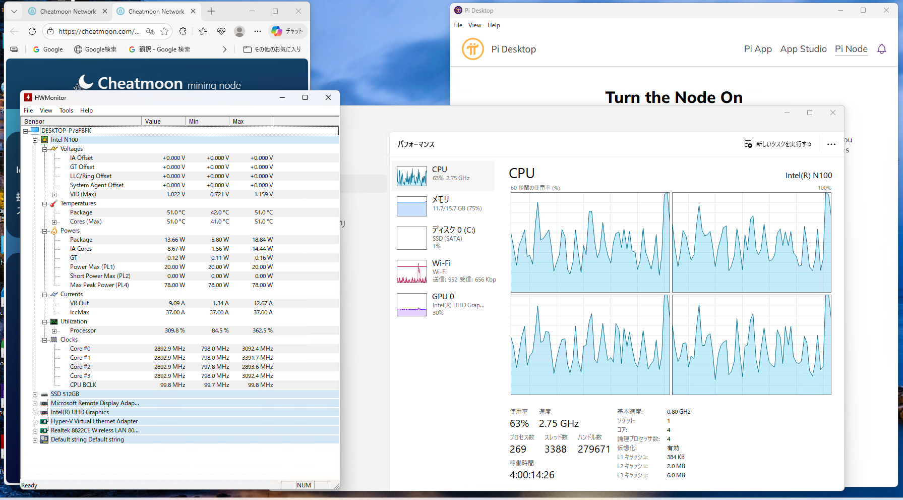 下記はPi Node、Cheatmoon mining node、タスクマネージャと